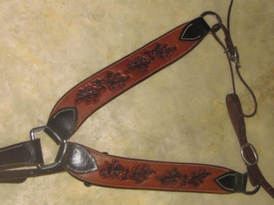 Flower carved, dyed background, 5” X 17” back piece, two steep holsters for 3 ½” barrel